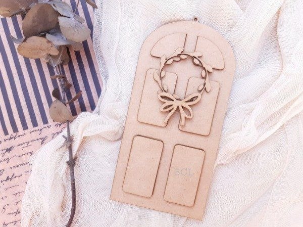Puerta navideña en fibro fácil viene sin pegar para facilitar su pintado, inluye corona y moño